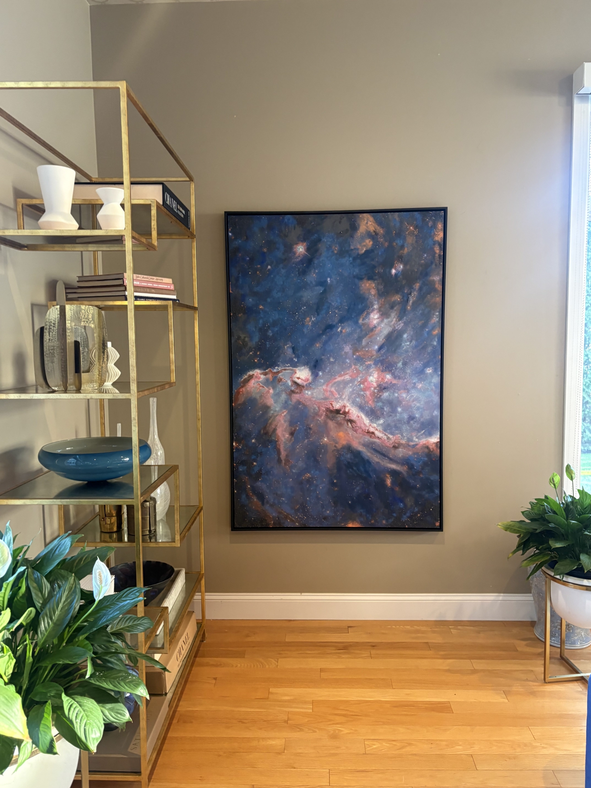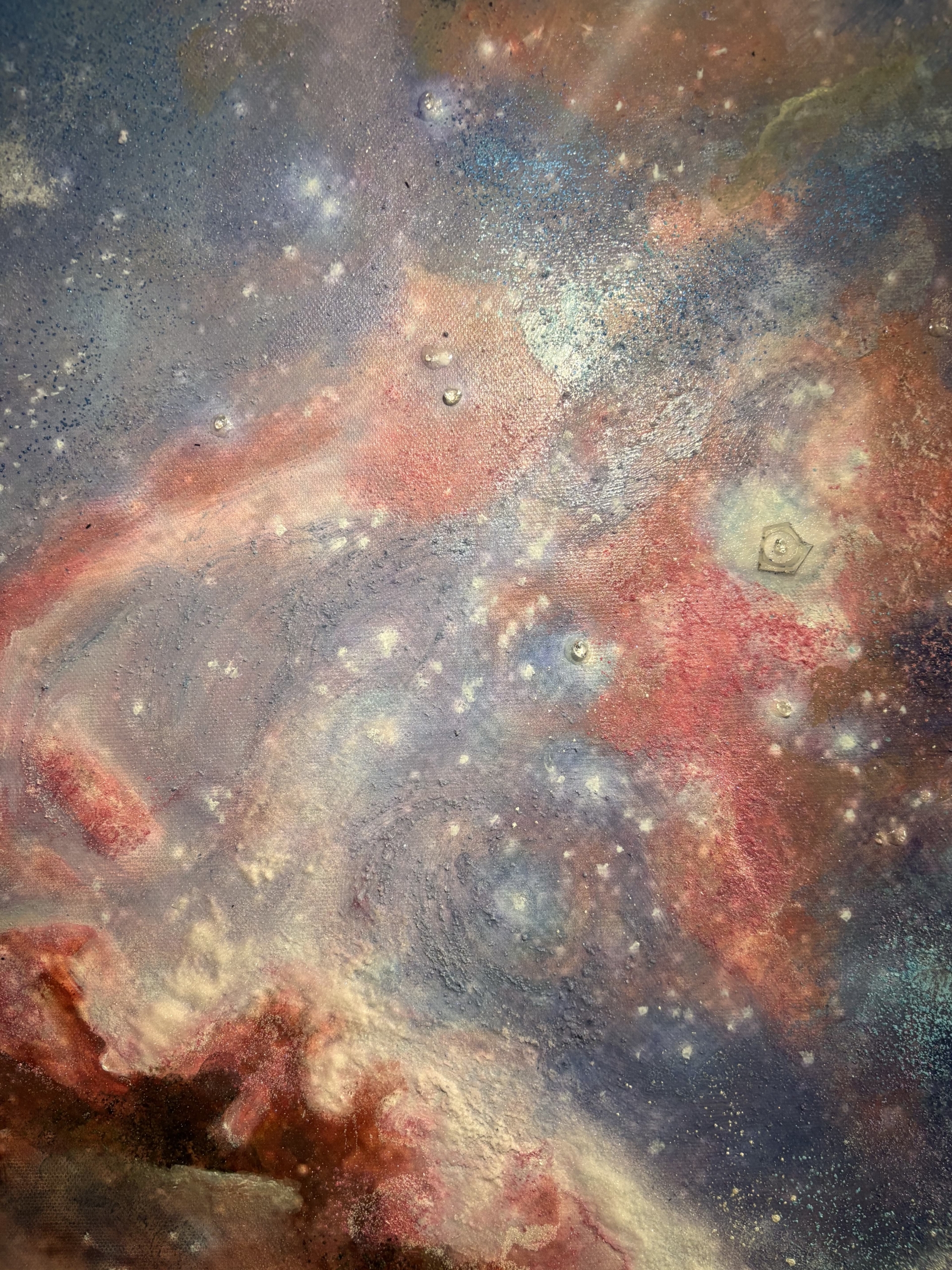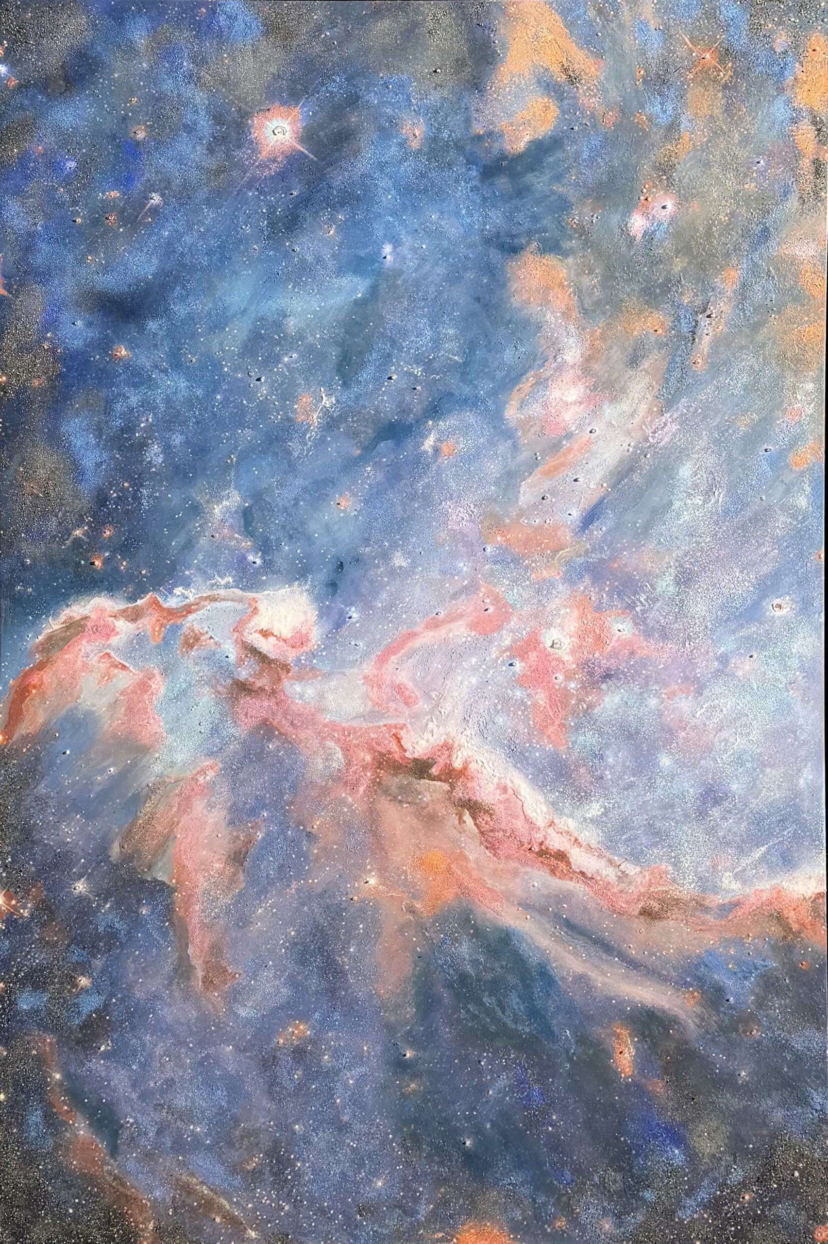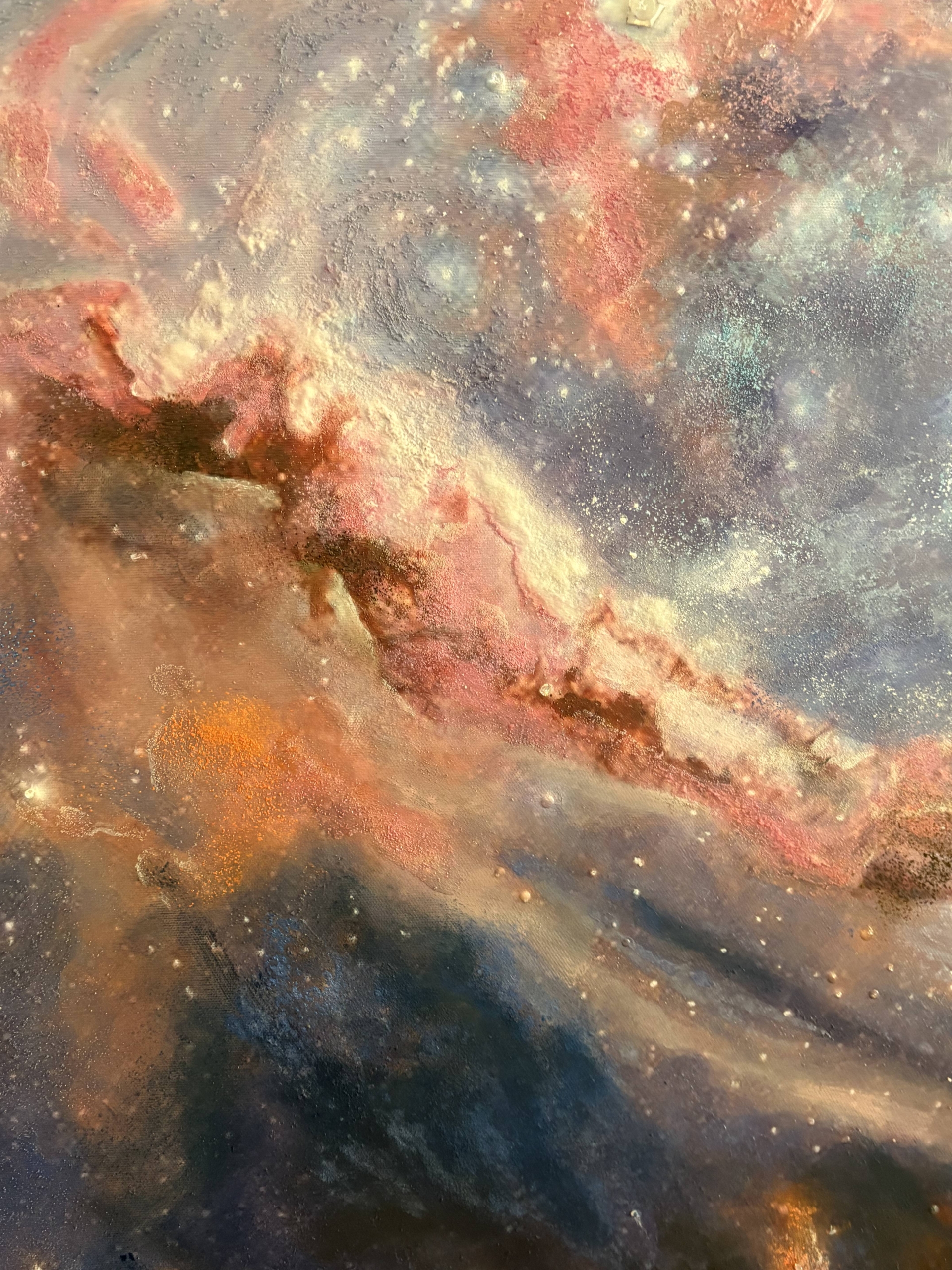 The composition suggests cosmic forces in collision; a theatre of expansion suspended in pigment.
