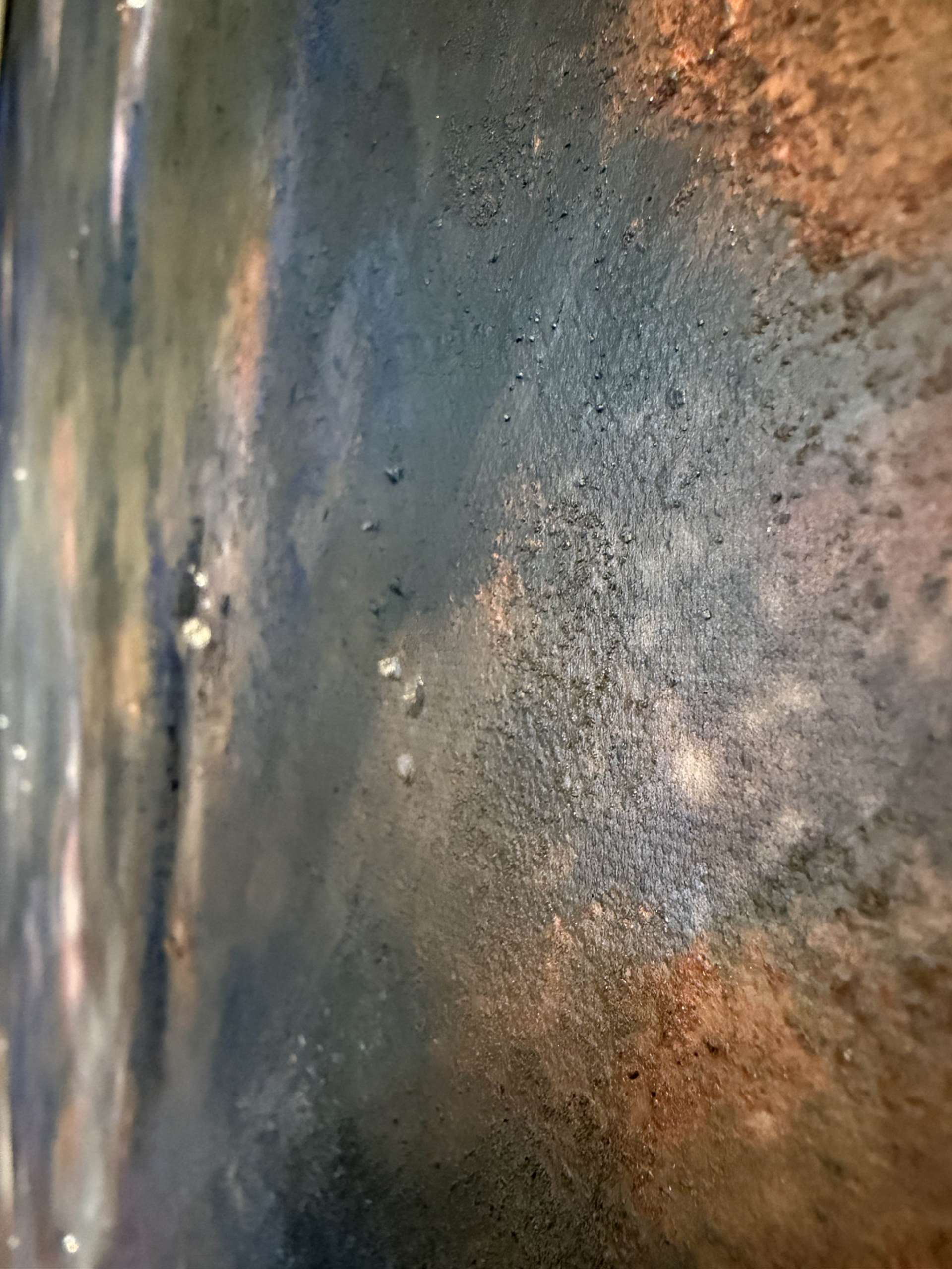Celestial blues and rose-hued currents traverse the canvas in a choreography of tension and release.